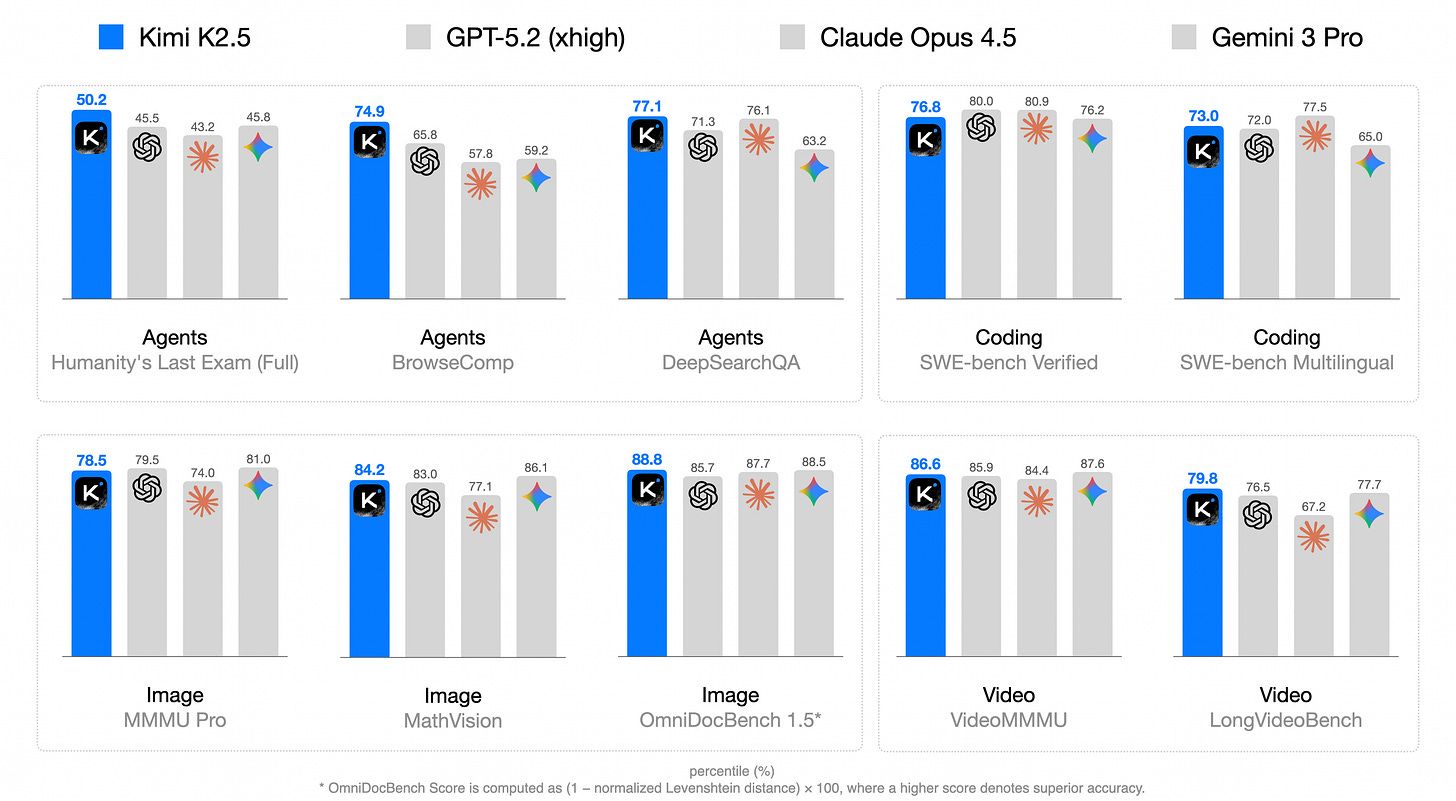 → Kimi K2.5 outperforms GPT-5.2 on the Humanity's Last Exam benchmark. An open weight model. 50.2% with tools versus GPT-5.2's 45.5%. Released January 27 by Moonshot AI. 1 trillion total parameters, 32 billion active per token. Priced at $0.60/$3.00 per million tokens, roughly one-fifth of Claude Opus 4.6. (Hugging Face / Maxime Labonne)