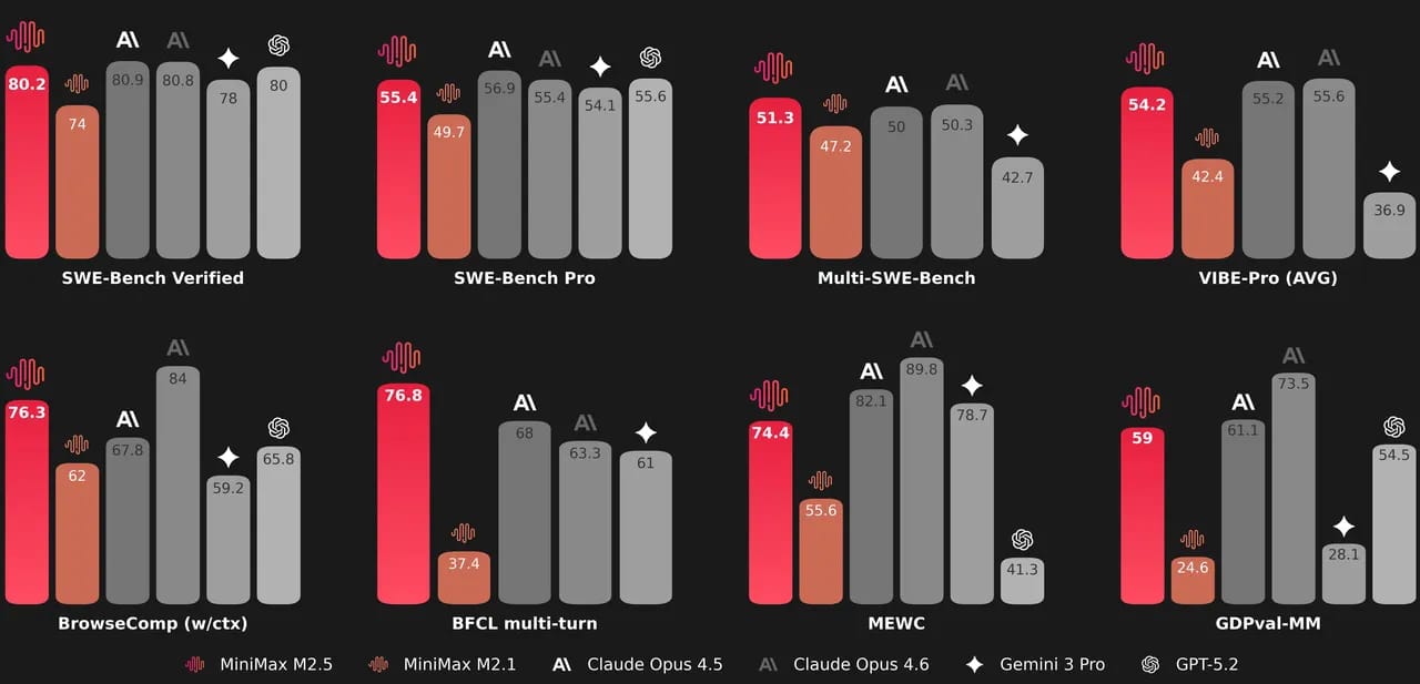 MiniMax M2.1 → M2.5: Task completion speed on SWE Bench up 37%. A coding task that took 33 minutes now takes 22.8 minutes. Wall clock improvement